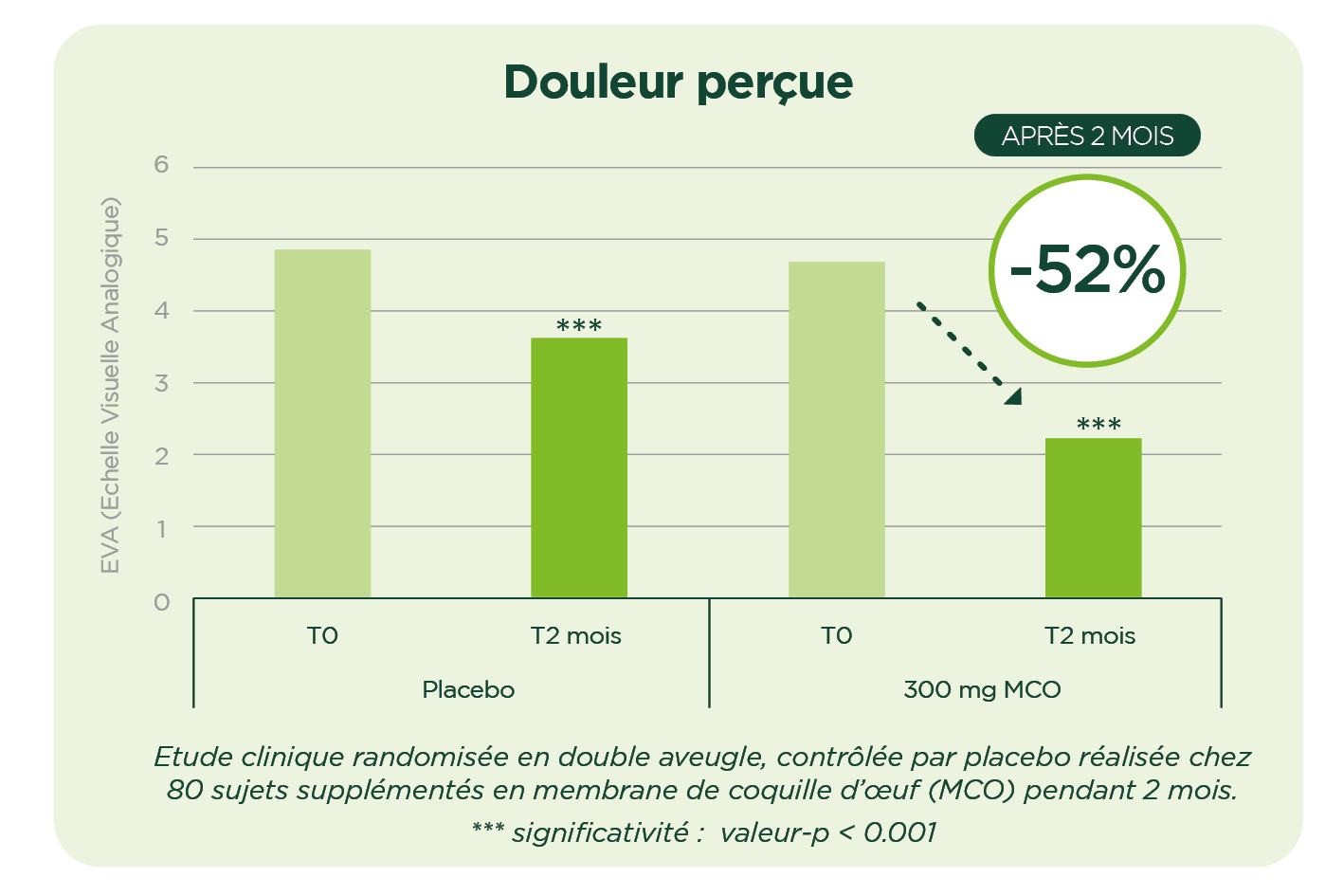 L’efficacité et la sécurité de la membrane de coquille d’œuf ont été validées par plus de 20 études scientifiques, dont 5 études cliniques sur la mobilité articulaire1–5. Chez des patients souffrant d’arthrose du genou, une supplémentation en collagène de coquille d’œuf a montré une réduction de la douleur de plus de 50 % en seulement 2 mois4.